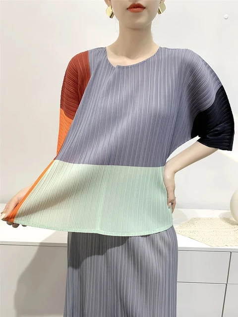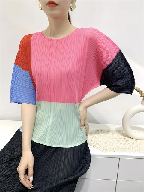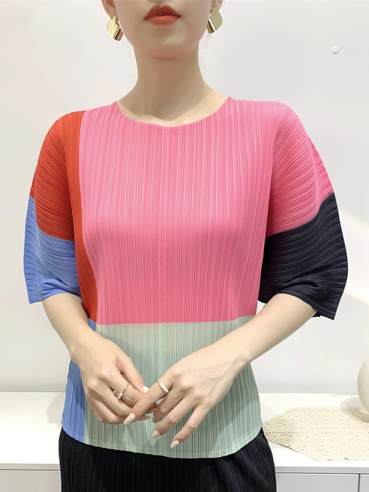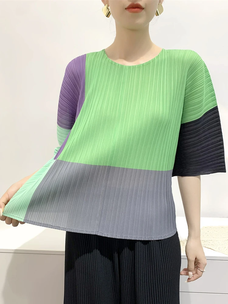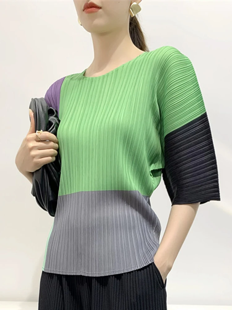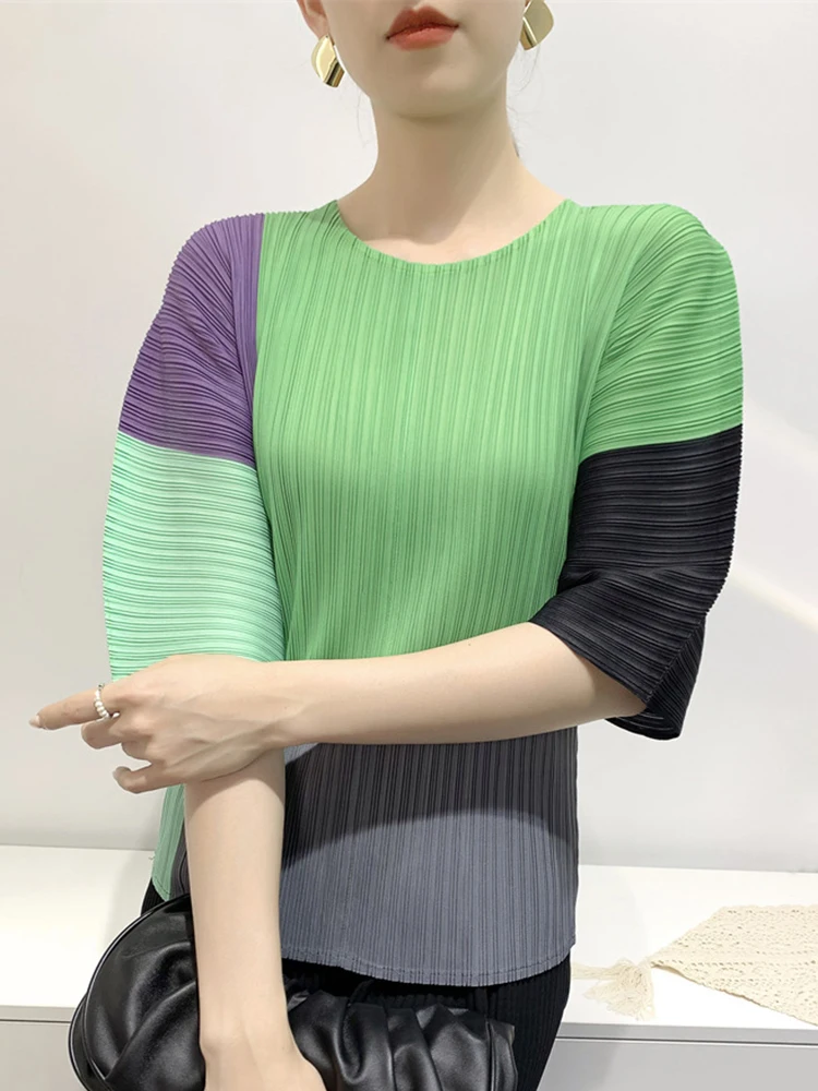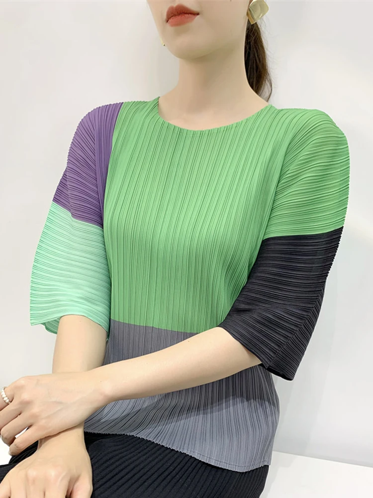 Contrast Color T-shirt For Women Round Neck Half Sleeves Thin Casual Tops Fashion Clothing