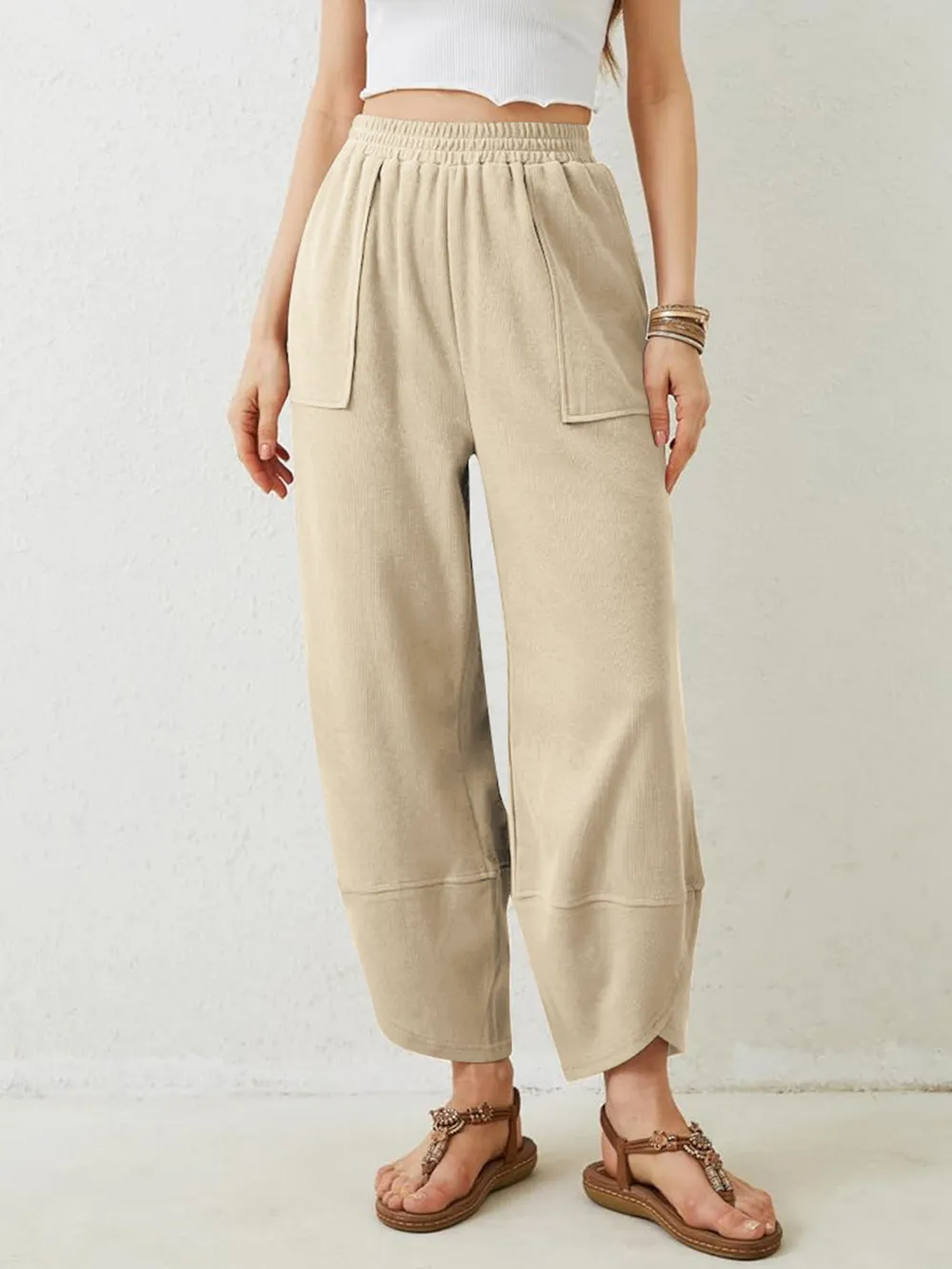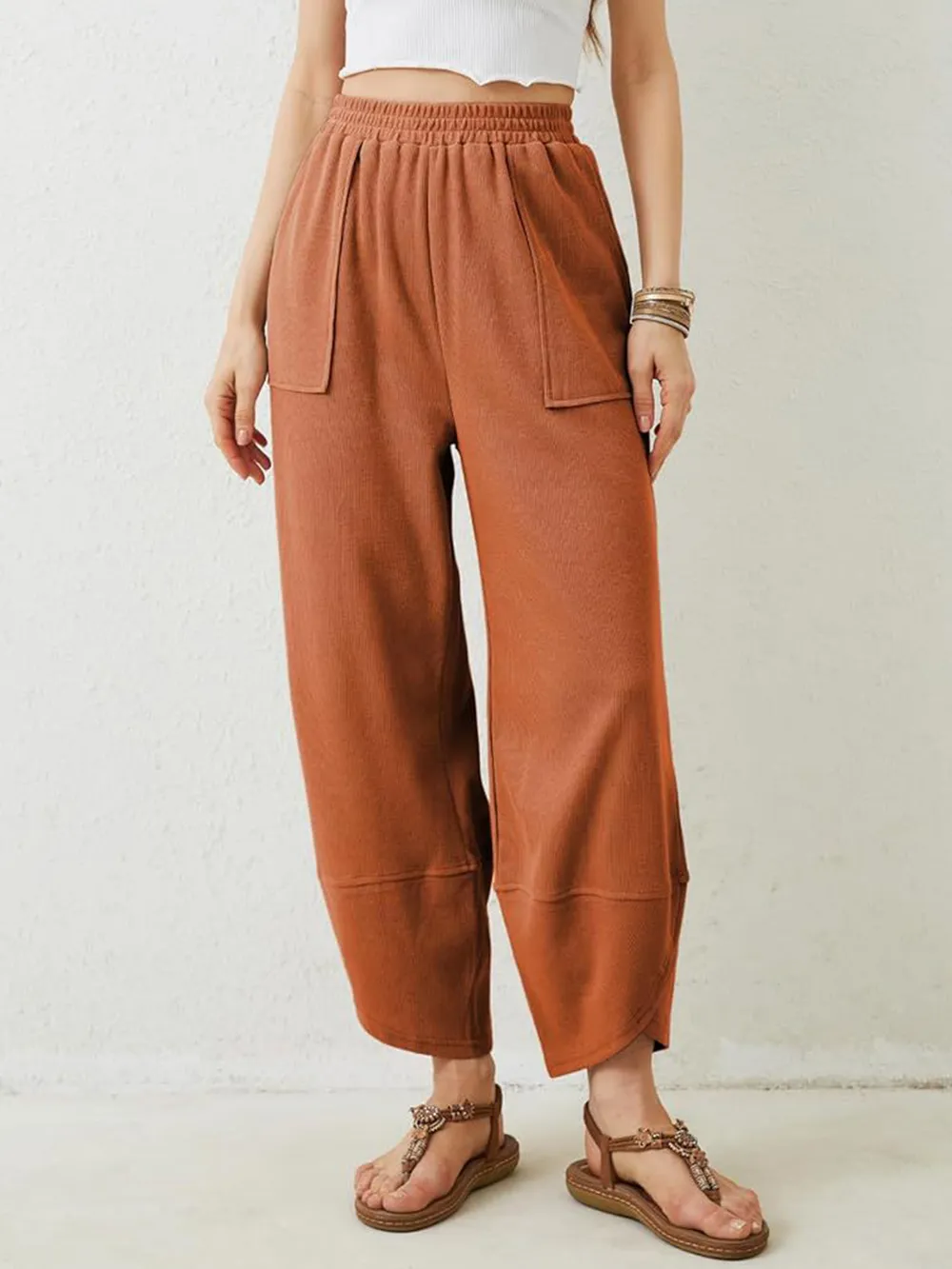Featuring a relaxed wide‑leg silhouette with an elastic waistband, these pants offer a comfortable, easy‑to‑wear fit that doesn’t cling to the body. The fit runs true to size — for the most flattering and comfortable result, select your size based on your waist and hip measurements, as body proportions such as height and weight help determine the best choice.