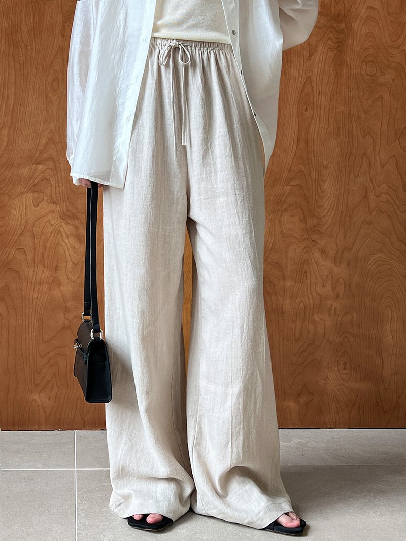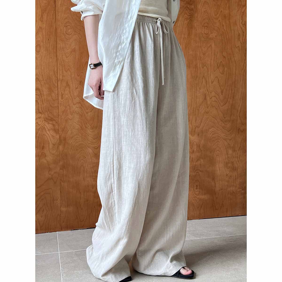 Linen drawstring wide leg pants for women breathable floor length pants