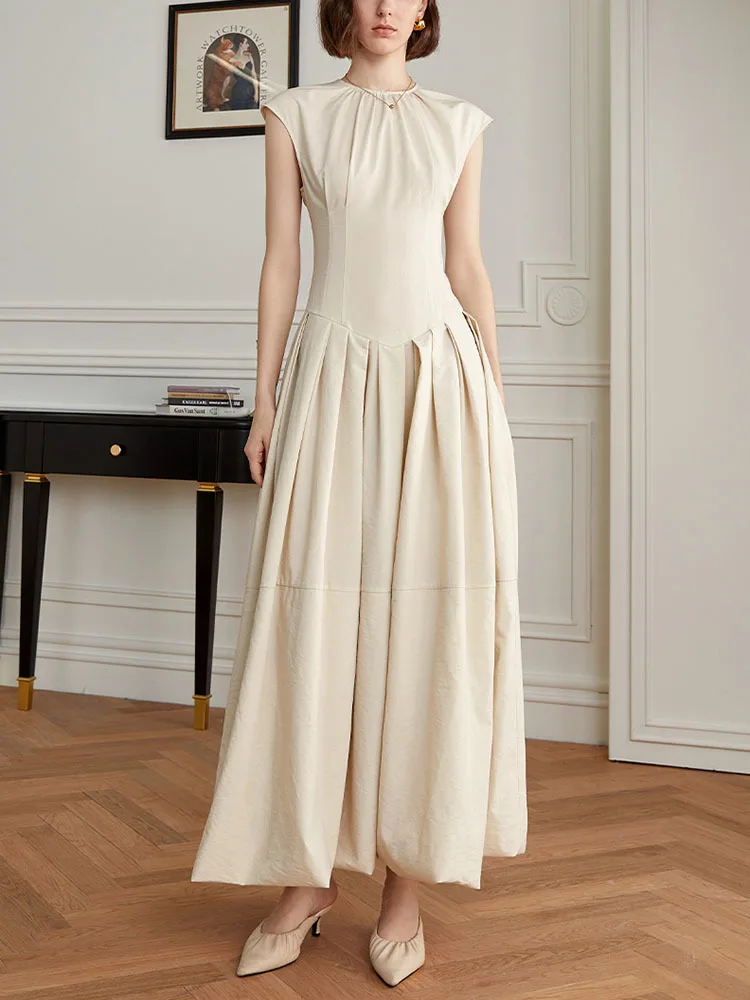 Crafted from a soft and lightweight woven fabric blend, this dress is designed to feel smooth, breathable, and comfortable throughout the day while maintaining a neat and elegant shape. The high-waist cut helps define the body line, while the pleated and spliced details add texture, dimension, and a more luxurious finish. The sleeveless design keeps the overall look clean and refined, making it easy to pair with heels, flats, delicate jewelry, and light outer layers for an elegant seasonal outfit.
