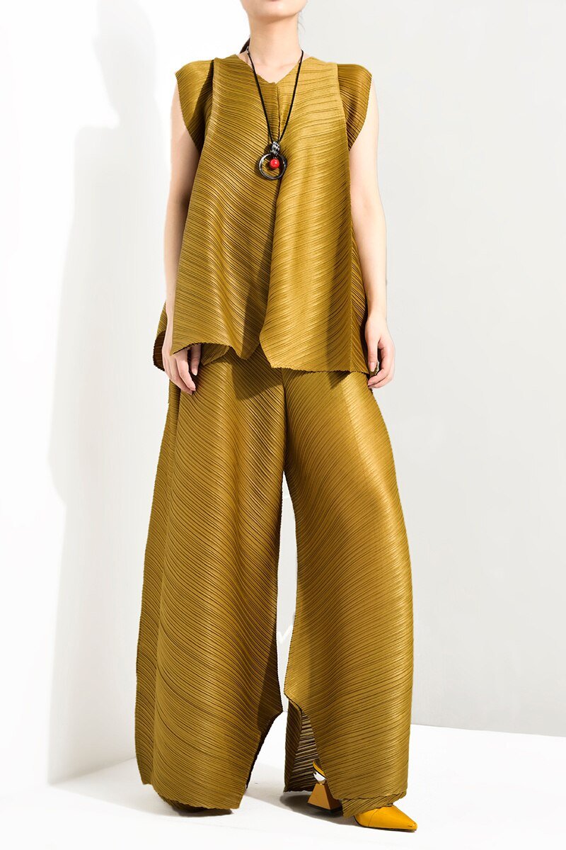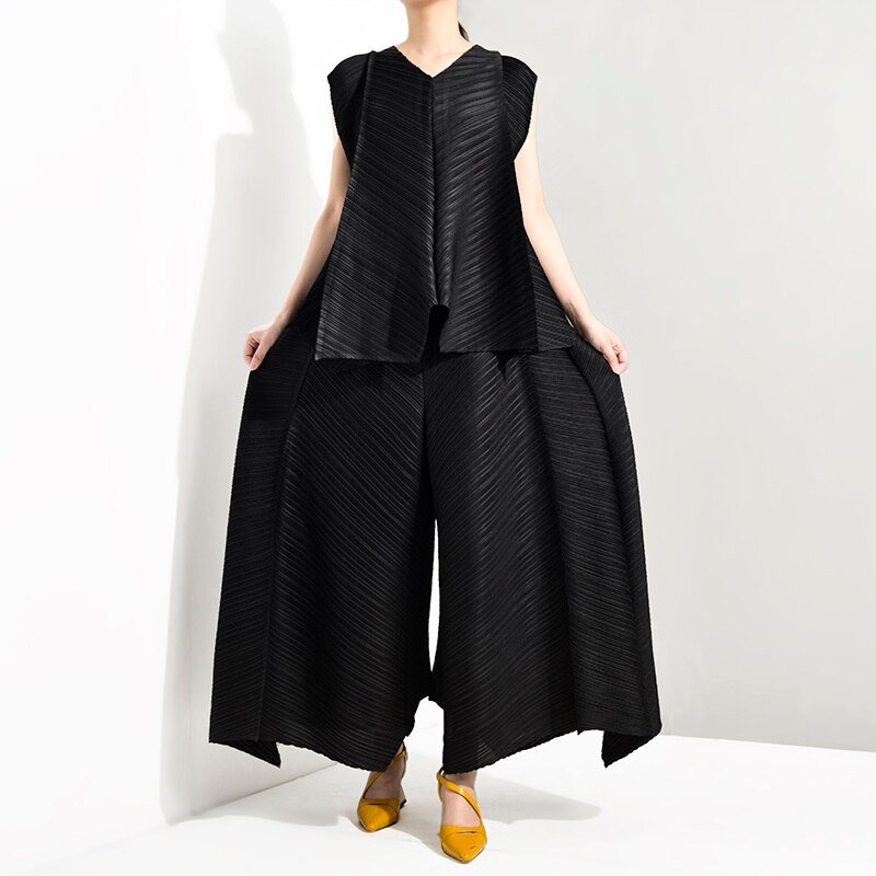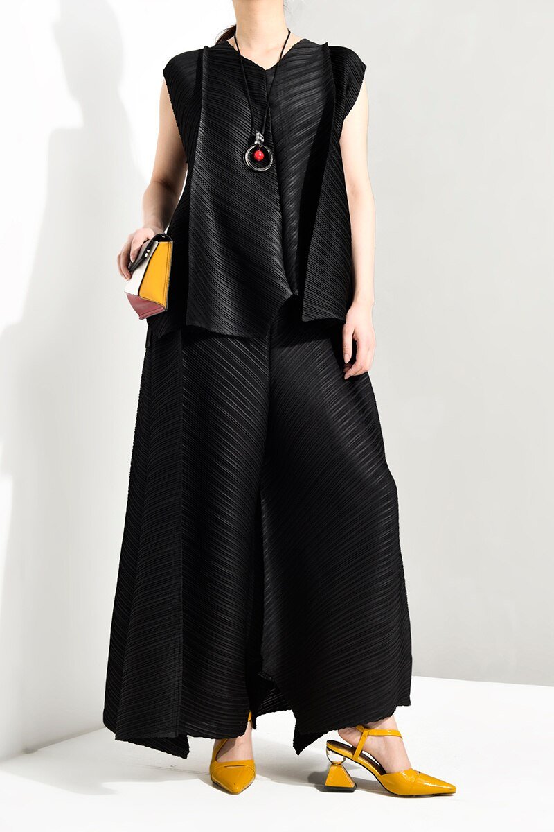 Summer New Temperament Women Loose Casual Pleated Sleeveless Vest Loose Wide Leg Pants Sets Female