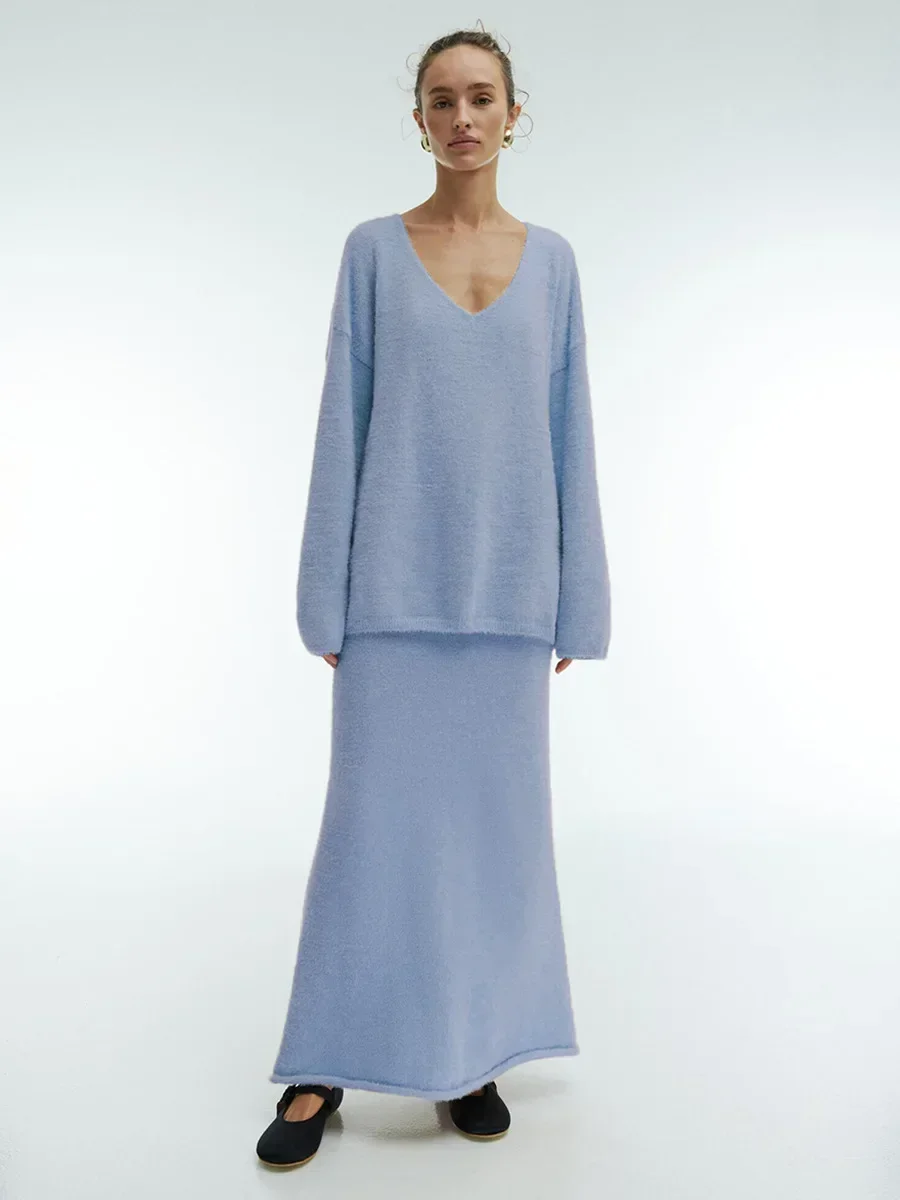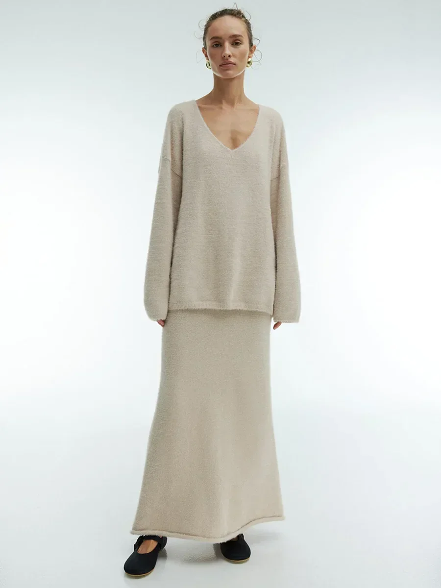 Women Knitted V-neck Sweater+Skirt Sets