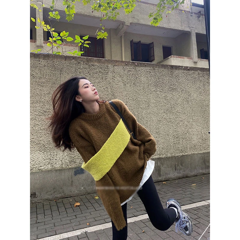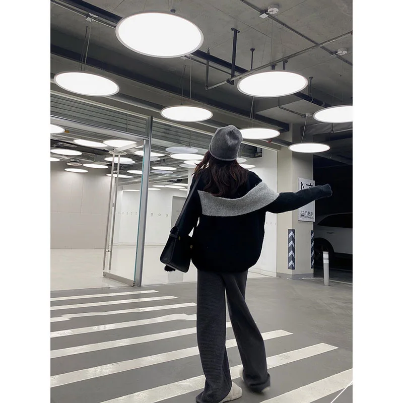 Women Sweater Patchwork Color Matching Pullover Sweater Tops Asymmetry Fashion Loose Knitting Tops Women