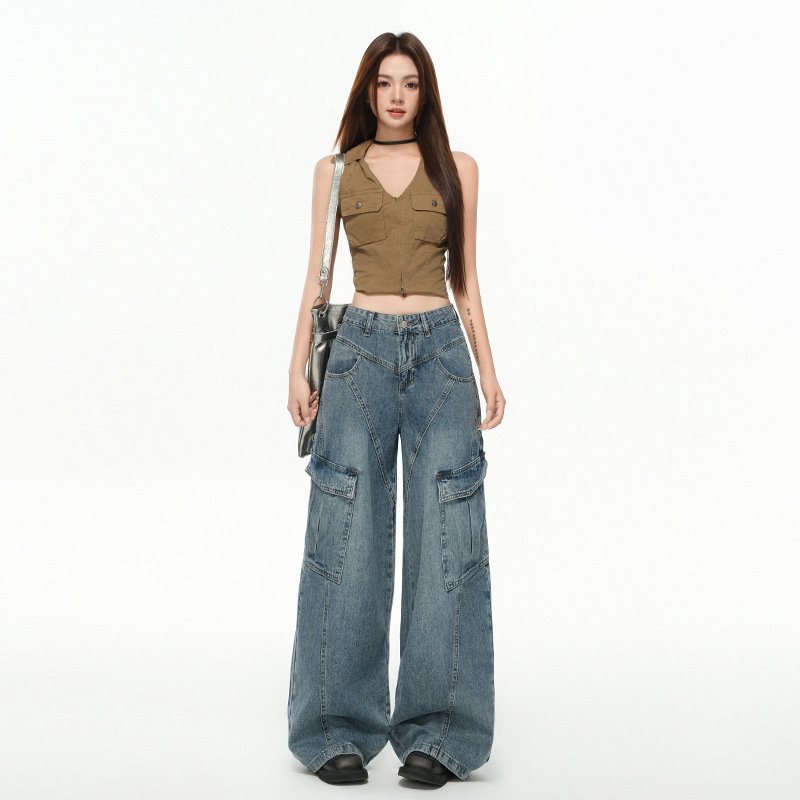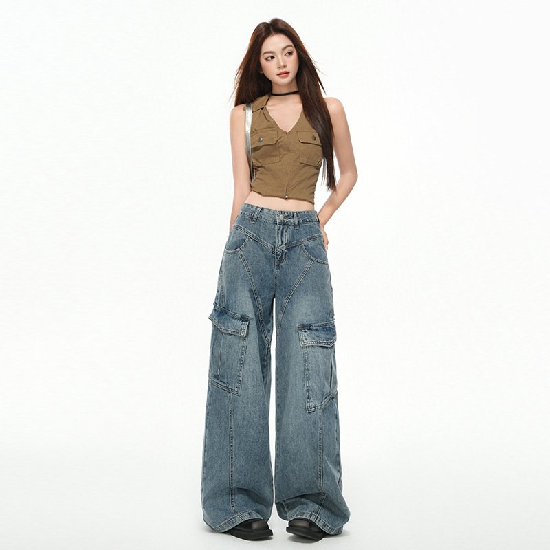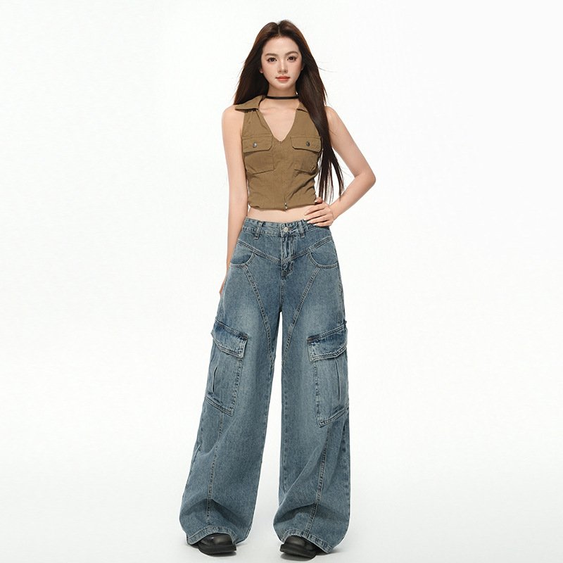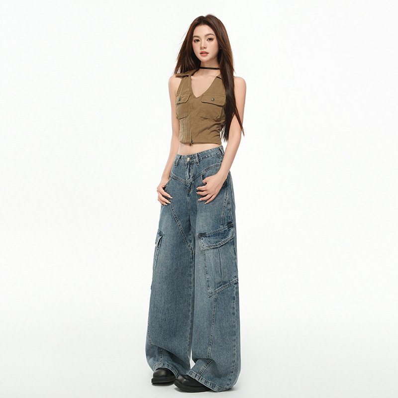 Women’s Multi-Pocket Workwear Denim Pants Loose Wide-Leg Pants